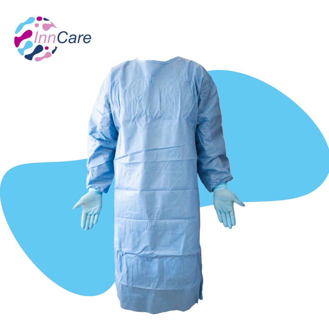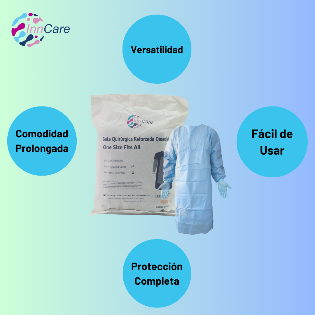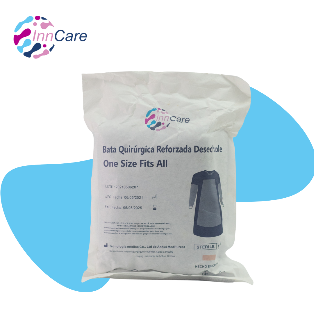 La Bata Quirúrgica Reforzada Desechable InnCare es ideal para proteger a profesionales de la salud durante procedimientos quirúrgicos y médicos de alto riesgo. Fabricada con materiales avanzados como PP/SMS/SMMS o PP+PE, ofrece resistencia, comodidad y una efectiva barrera contra líquidos y microorganismos. Su diseño ergonómico permite libertad de movimiento y comodidad para un uso prolongado.
